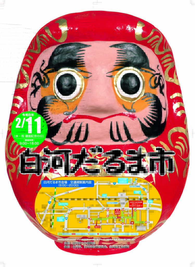 白河だるま市は旧奥州街道沿いの1.5キロメートルに約500軒の露店が立ち並び、白河だるまなどを買い求める人々で賑わいます。白河だるまは松平定信とも関わりが深く、市民に愛されている縁起物です。
