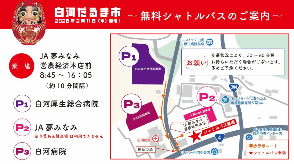 白河だるま市「シャトルバスのご案内」 26/01/05 26/01/06 未分類 令和8年2月11日(水・祝)開催の白河だるま市! 当日はシャトルバスが運行します。駐車台数にも余裕がございますので是非ご利用ください。 だるま市シャトルバス [LED用]